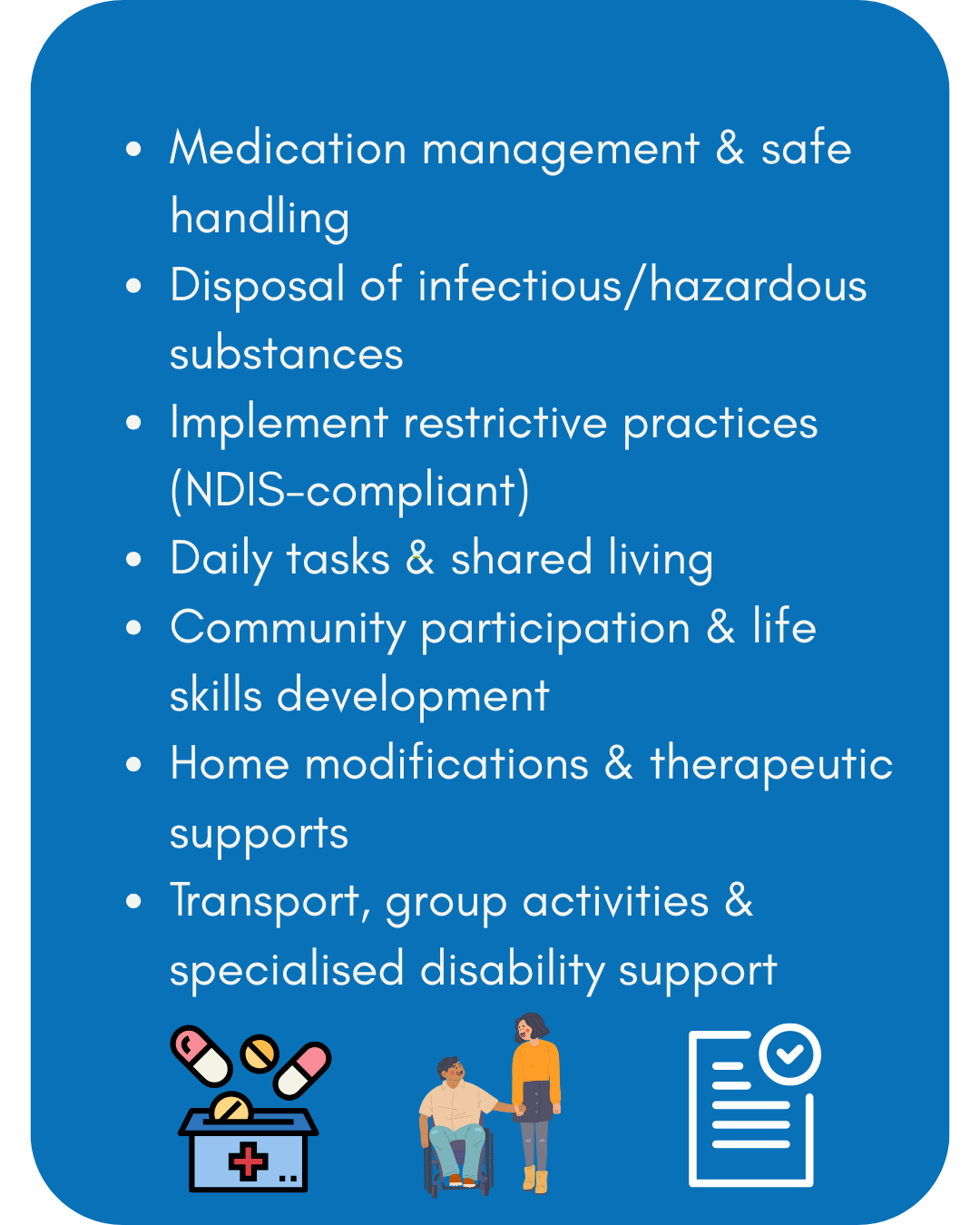 Our dedicated team supports participants with everyday tasks like personal hygiene, meal preparation, medication management, and household chores. Ensuring comfort, dignity, and a high quality of life.